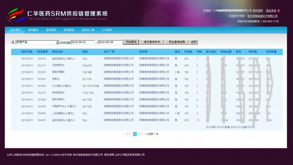 供應商隨時可以登錄系統(tǒng)按照指定要求進行檢索藥品進貨并導出查詢結果。